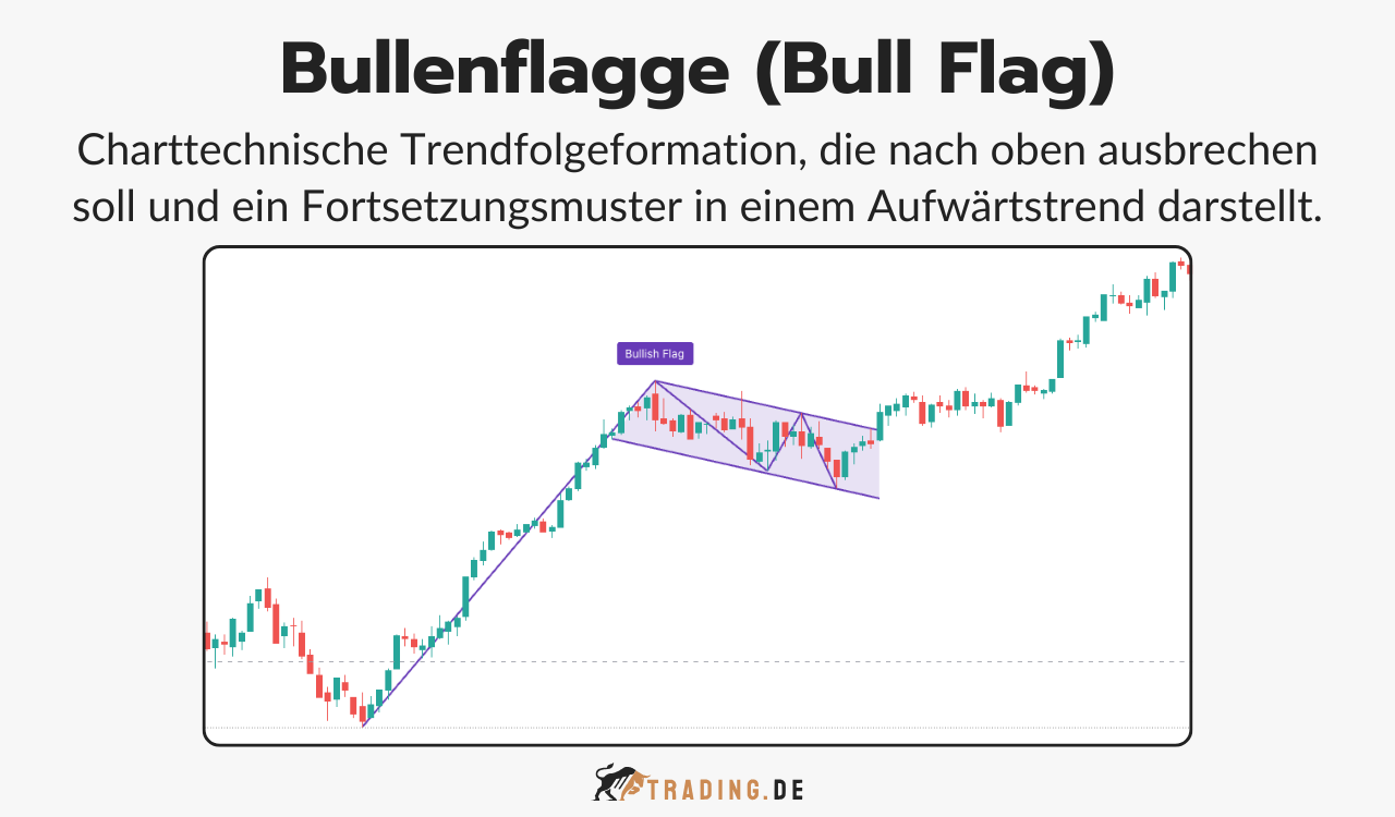 Die Bullenflagge ist eine charttechnische Trendfortsetzungsformation. Die Grundvoraussetzung zur Identifikation einer Bullenflagge ist immer, dass sich der Kurs des Basiswertes innerhalb eines Aufwärtstrends befindet. Der Basiswert bewegt sich innerhalb eines fallenden Trendkanals, bevor letztendlich eine weitere Aufwärtsbewegung folgt.