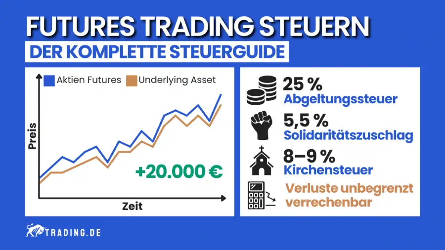 Beim Futures Trading in Deutschland unterliegen die Gewinne der Abgeltungssteuer von 25 % zuzüglich des Solidaritätszuschlags in Höhe von 5,5 % und gegebenenfalls der Kirchensteuer. Insgesamt beträgt die Steuerbelastung damit rund 26,375 % ohne Kirchensteuer.