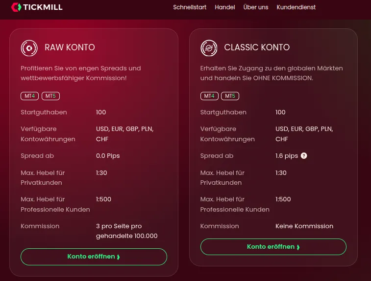 Ab einem Startguthaben von 100 USD können Sie bei Tickmill ein Konto eröffnen und haben die Wahl zwischen den Raw-Accounts und Classic. Wir haben uns beide Optionen angeschaut und fanden vor allem Raw mit Spreads ab 0,0 Pips und 3 USD Kommission pro Seite und Lot ansprechend. Alternativ fällt die Ordergebühr bei Classic komplett weg. Dafür sind die Spreads mit Spannen ab 1,6 Pips unserer Erfahrung nach vergleichsweise hoch.