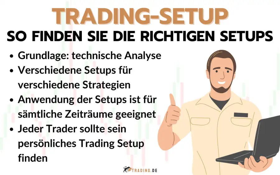 Ein Trading Setup ist eine Idee und ein Trading Plan, der unabdingbar für den erfolgreichen Handel mit Finanzprodukten ist. Es gibt allerdings nicht das eine Trading Setup. Stattdessen sind die einzelnen Regeln und Parameter abhängig, welche Handelsziele Sie haben, welchen Handelsstil Sie praktizieren und wie Ihre persönlichen Erfahrungen und Ihr Wissensstand im Hinblick auf den Handel sind.