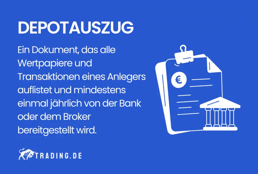 Ein Depotauszug enthält die wichtigsten Informationen über die Wertpapiere, die in einem Depot verwahrt werden und wird von Ihrer Bank oder Broker erstellt. Mindestens einmal im Jahr wird den Depotkunden eine Auflistung mit den Positionen und Kontoständen des Depots zugesandt. Depotauszüge sind meistens online verfügbar oder werden auf dem Postweg verschickt.