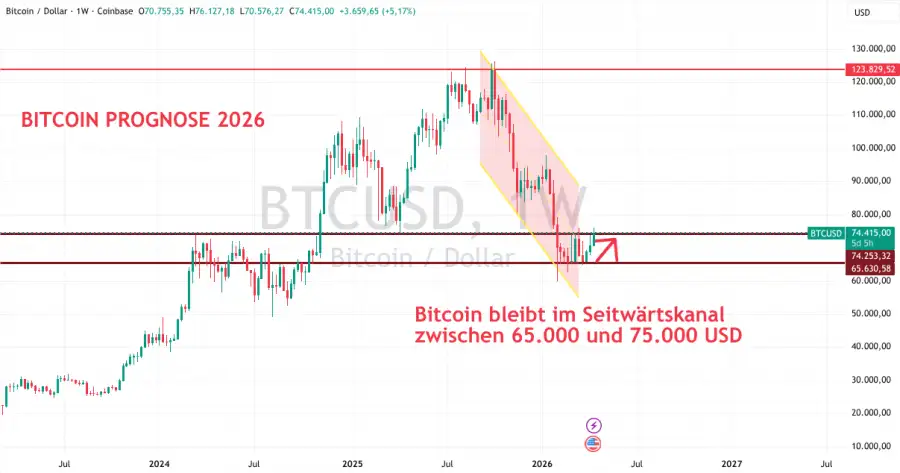 - Technische Analyse: Nach mehrmaligem Austesten des Widerstands bei 120.000-125.000 USD kam es im Oktober/November zu einem rasanten Absturz und einem möglichen Ende des langjährigen Aufwärtstrends. Der Kurs ging bis zum Februar 2026 unter den alten Widerstand von 2024 und landete bei weniger als 64.000 USD. Mittlerweile kam es zu Erholungsphasen, die Kryptowährung verharrt aber insgesamt in einem Seitwärtskanal zwischen 65.000 und 75.000 USD.