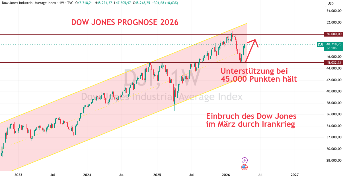 Seit etwa 2022 geht der Trend beim Dow Jones kontinuierlich nach oben. Getrieben durch die Tech-Industrie hat der Index im Januar 2026 einen Rekordstand von 50.000 Punkten (Widerstand) erreicht. Mit Korrekturen wurde aufgrund mehrerer Faktoren wie der KI-Blase gerechnet. Im März traten die Abschwünge letztlich durch den Beginn des Irankriegs und die gestiegenen Ölpreise ein. Trotzdem konnte sich der Kurs bei einer Unterstützung um 45.000 Punkte fangen und drehen. Positive Entwicklungen wie eine mögliche Öffnung der Straße von Hormuz im Persischen Golf wirken sich mit einem Aufschwung auf den Index aus.