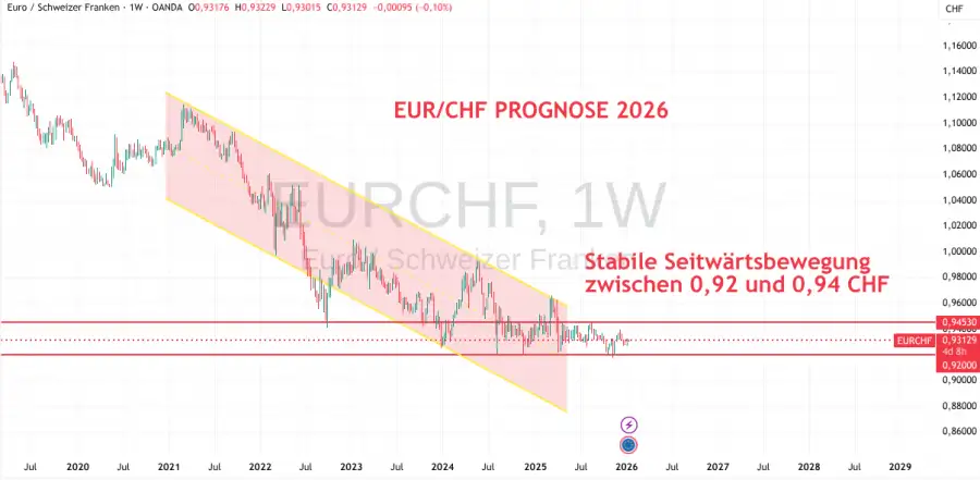 EUR/CHF im langfristigen Abwärtstrend: Aktuell befindet sich der Markt in einer Seitwärtsphase zwischen etwa 0,92 und 0,945 CHF (Stand: 12. Januar 2026)