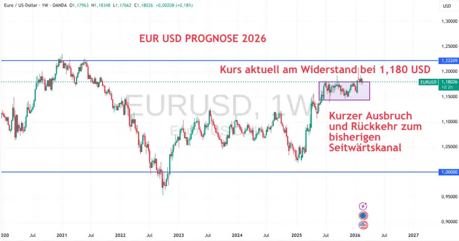 Ein Durchbruch auf bis zu 1,20 USD im Jahr 2026 ist denkbar, jedoch stark von der politischen Lage in den USA abhängig. Die aggressive Zoll- und Territorialpolitik von US-Präsident Donald Trump in Bezug auf Regionen wie Grönland, Iran und Venezuela sorgte zuletzt für ein Absinken. Die Ausrichtung des neuen amerikanischen FED-Chefs orientiert sich allerdings an einer Stabilisierung des Dollars.