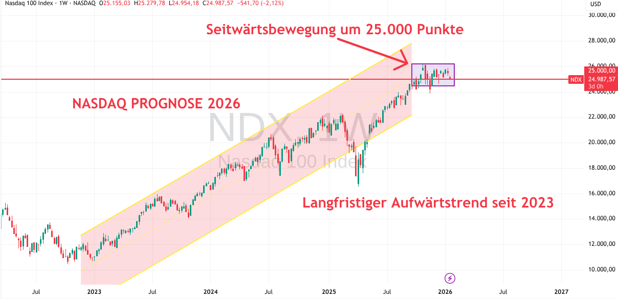 Der Nasdaq Kurs befindet sich seit etwa 2023 in einem langfristigen Aufwärtstrend, der im ersten Zollstreit der Trump-II-Administration im Frühjahr 2025 stark abfiel, dann aber wieder Fahrt aufnahm. Seit Herbst befindet sich der Index in einer Seitwärtsphase rund um das Allzeithoch bei 25.000 Punkten. Aktuell droht Donald Trump in der Grönland-Frage erneut hohe Zölle gegen die EU an, was die Tech-Märkte in Amerika stark belasten könnte. Beim Wirtschaftsforum in Davos bekräftigte er nochmals seine Forderungen. Zudem steht auch im Januar 2026 die Angst vor der KI-Blase im Raum, eine Branche, die den Hauptanteil am Nasdaq hat. Dennoch sehen Experten Potenzial bis zu etwa 26.000 Punkten bis Ende 2026.