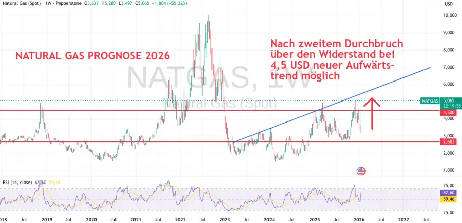 eee2025 brach der Kurs für Natural Gas sehr dramatisch aus der vorherigen Seitwärtsbewegung aus und bewegte sich seither in einem Kanal zwischen etwa 2,60 und 4,50 USD. Seit Oktober kam es zu einem rapiden Anstieg der GaspreiseAnstieg was bereits zweimal für neue Ausbruch über den Widerstand hinaus bis zu ca. 5,20 USD sorgte. Dieses Wachstum dürfte in Zusammenhang mit der Heizperiode und dem vergleichsweise kalten Winter stehen. Im Januar 2026 kam es zu einem weiteren Wachstum. Für Mitte des Jahres sind jedoch weitere Sprünge über den bisherigen Widerstand möglich, so z. B. laut Bloomberg.