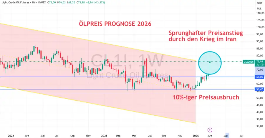 Seit etwa 2022 befindet sich der Kurs von Rohöl in einem kontinuierlichen Abwärtstrend und war über einen längeren Zeitraum hinweg in einem Seitwärtskanal zwischen 56 und 65 USD gefangen. Bereits im Juni 2025 kam es durch den Angriff Israels auf Iran zu einem Ausbruch nach oben. Die amerikanisch-israelische Intervention und der Kriegsbeginn im März 2026 haben eine neuerliche Preissteigerung über den Widerstand hinweg auf bis zu 77 USD pro Barrel bewirkt.