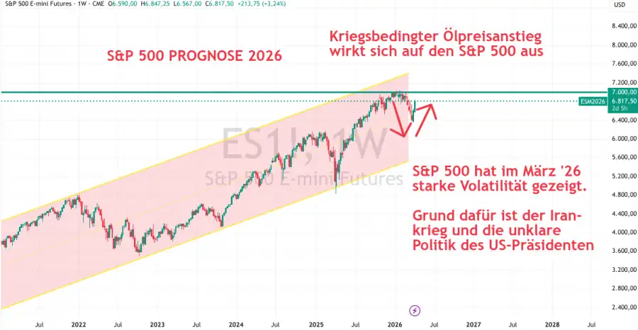 - Prognose 2026: Experten erwarten ein zweistelliges Gewinnwachstum. Bullische S&P 500-Prognosen liegen für Ende des Jahres in einem Bereich von 7.000-8.000 Punkten. Der Aufwärtstrend scheint auch mit den Einbrüchen im März weitgehend intakt zu sein.