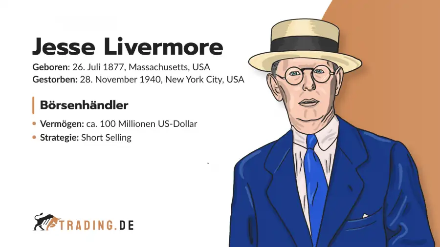 Jesse Livermore (26.07.1877 – 28.11.1940) war einer der bekanntesten Börsenspekulanten, der durch seine waghalsigen Wetten an der Wall Street bekannt wurde. Schätzungen zufolge belief sich Livermores Vermögen nach dem Crash von 1929 auf über 100 Millionen US-Dollar, was heute mehreren Milliarden entspräche, hauptsächlich verdient durch Aktien und Rohstoffe und einer trendbasierten Trading-Strategie. Jesse Livermoe gilt als einer der Pioniere des modernen Tradings und wurde durch das Buch “Reminiscences of a Stock Operator” (1923).