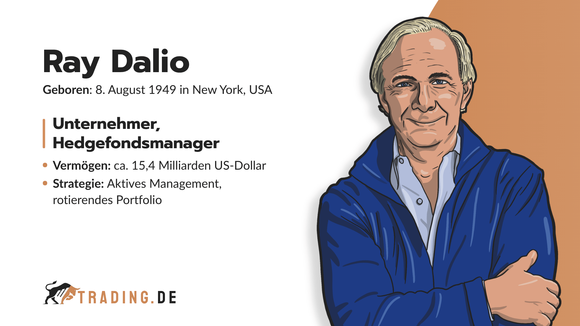 Ray Dalio (geboren 08.08.1949) wurde in erster Linie als Gründer der amerikanischen Investmentgesellschaft Bridgewater Associates und sein Allwetter-Portfolio mit diversifizierter Trading-Strategie bekannt, die ihm ein Gesamtvermögen von rund 15,4 Milliarden US-Dollar einbrachte.