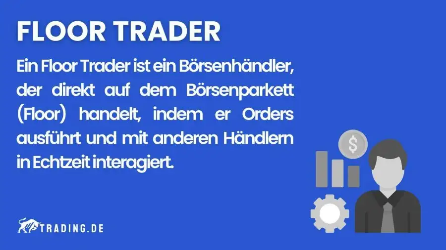 Ein Floor Trader ist ein Händler auf dem Handelsparkett (Trading Floor), der an einer Börse handelt und dabei Käufe und Verkäufe von Finanzinstrumenten auf eigene Rechnung für Brokerunternehmen oder Investmentfirmen durchführt. Floor Trader handeln also auf eigene Rechnung und tragen selbst das Risiko.